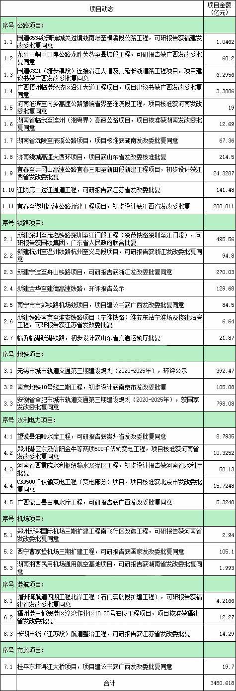 據統(tong)計,3月份國家(jia)及省市級發(fa)改委、交通運輸廳共(gong)批復了約 33 項(xiang)重大工程(cheng)項(xiang)目(mu)的(de)(de)可行性研究報告、初步設計、項(xiang)目(mu)核準建議(yi)書以及環評公(gong)示等,總(zong)的(de)(de)項(xiang)目(mu)投資(zi)額近 3500 億元(yuan)(yuan)。包(bao)含約 831 億的(de)(de)公(gong)路項(xiang)目(mu),1103 億的(de)(de)鐵路項(xiang)目(mu),1295 億的(de)(de)城軌交通項(xiang)目(mu),90 億的(de)(de)水利電力(li)項(xiang)目(mu),110 億機場(chang)項(xiang)目(mu),以及約 50 億的(de)(de)港航、市政工程(cheng)。加上1-2月份,本年度(du)(du)一(yi)季度(du)(du)已經發(fa)布(bu)了約有(you) 7815 億元(yuan)(yuan)的(de)(de)項(xiang)目(mu)動(dong)態。