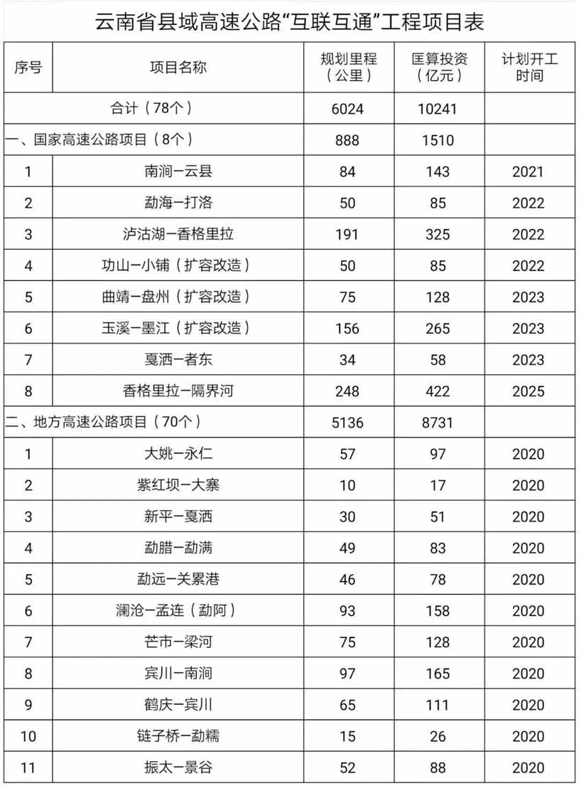 2020—2025年,開工建設高速公路項目78個,里程6024公里,總投資10241億元。其中,國家高速公路項目8個,里程888公里,投資1510億元;地方高速公路項目70個,里程5136公里,投資8731億元。