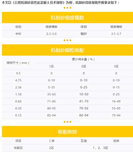 本文以《公路機制砂高性能混凝土技術規程》為例,機制砂具體規格參數要求如下: